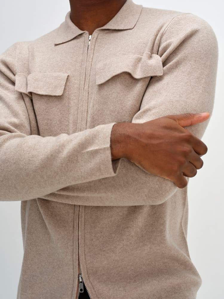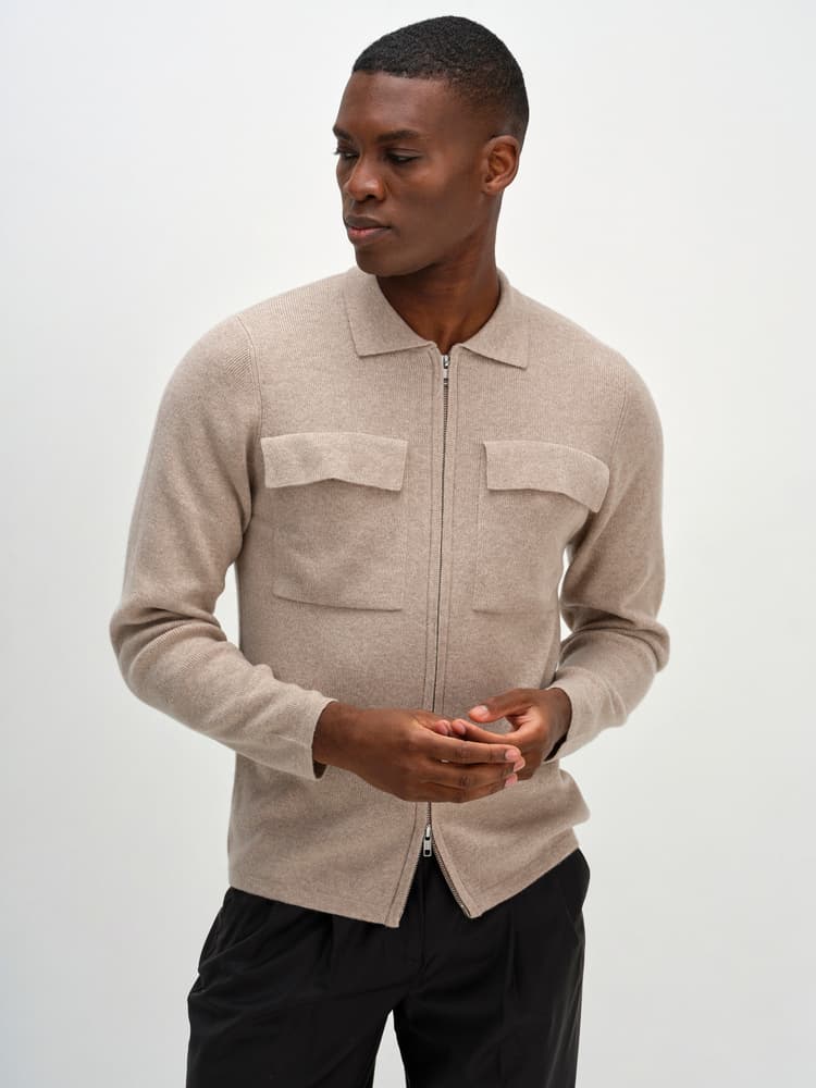 Stickad cardigan med krage och dragkedja framtill. Stickad i s.k fullneedle-stickning. Fickor framtill, ribb vid både ärmslut och nederkant. Normal i storlek och passform. En cardigan som passar alla tillfällen - helt enkelt riktig garderobsklassiker.