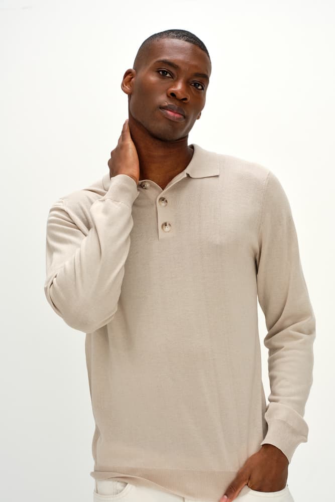 Vår Man Collar är den ultimata tröjan för dig som vill ha en stilfull och avslappnad look. En långärmad tröja som med sin krage och sina knappar gör sig bra vid nästan alla tillfällen. Enkelstickad och har en standardpassform.- Om du är osäker på vilken storlek du ska välja, se vår storleksguide. - Modellen bär storlek medium - {cus_attr_fabric_gauge}