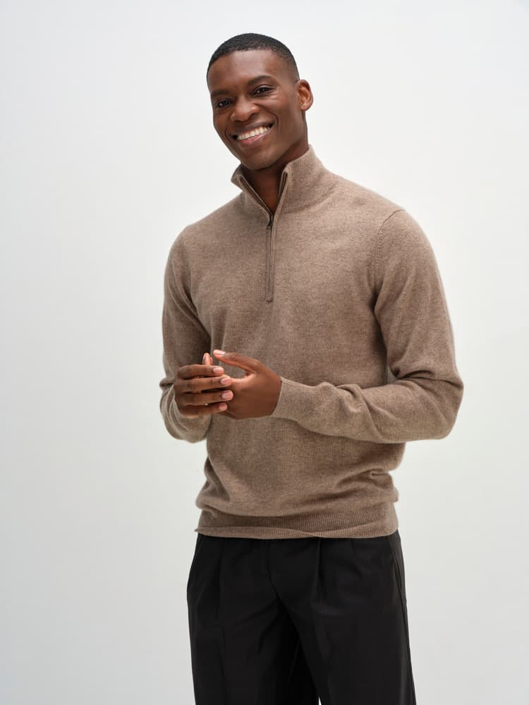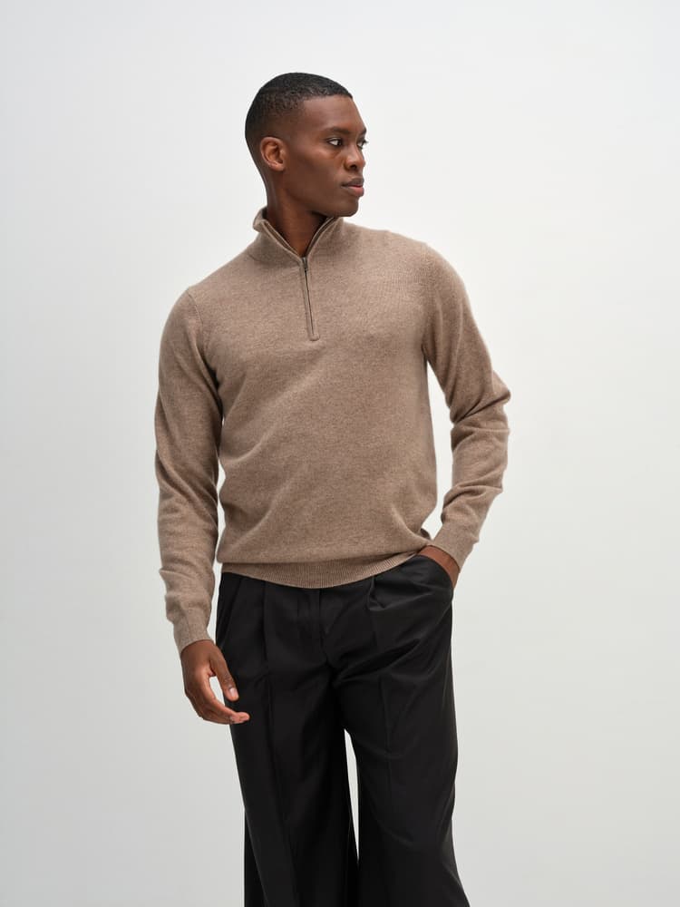 En slätstickad tröja med en kortare blixtlås upptill. Skiftande färg på insidan av krage. Ribb vid både ärmslut och nederkant. Normal i storlek och passform.