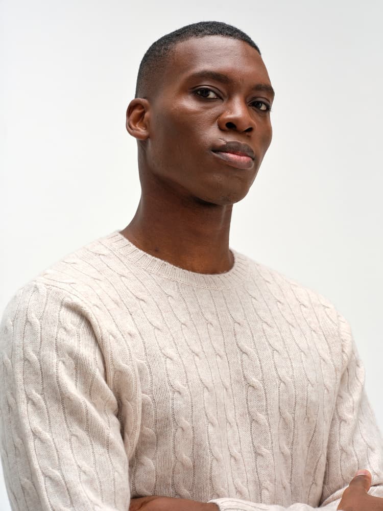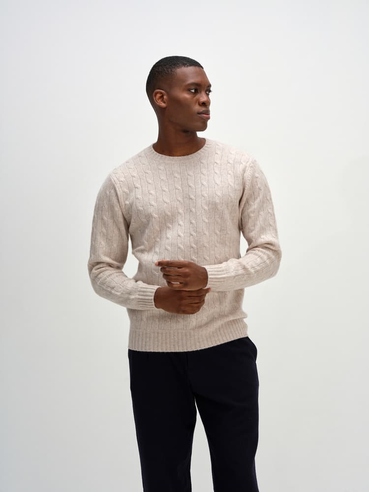 Klassisk kabelstickad tröja med rundad halsringning och ribbade kanter runt hals, ärmar och nederkant.