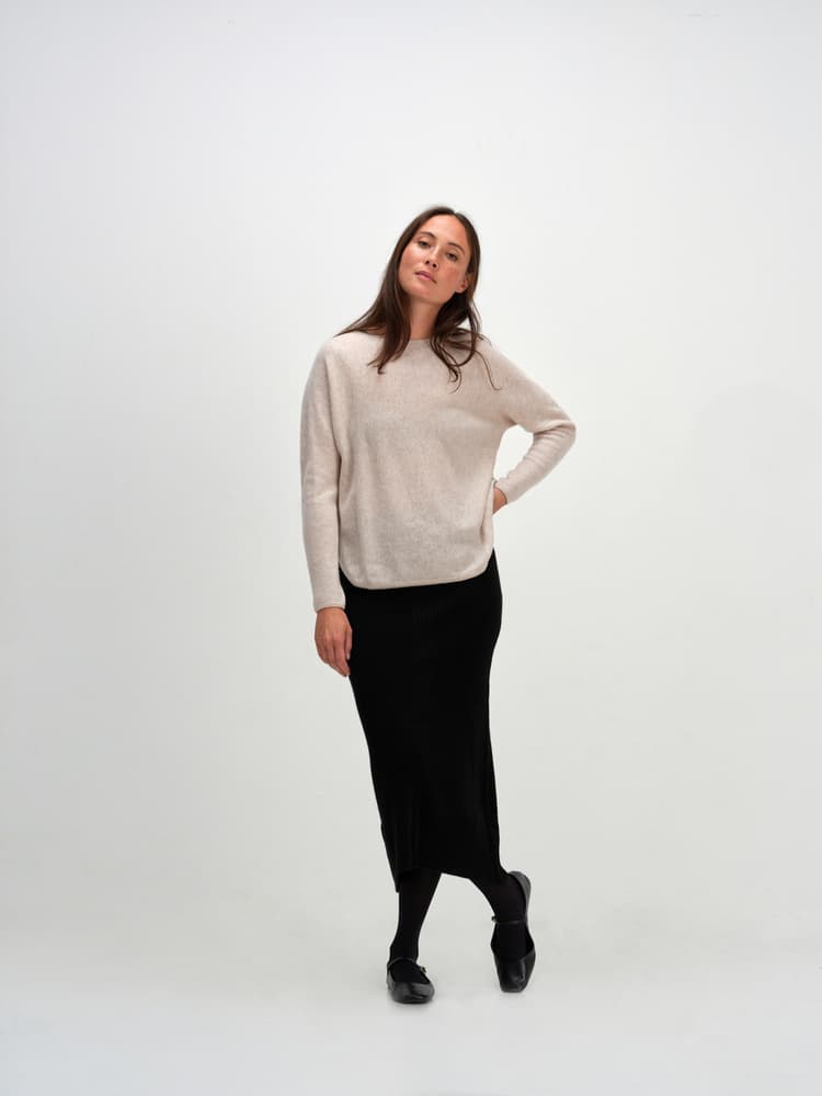 Ribbstickad A-linje formad kjol i en längre modell. Resår i midjan och figurnära upptill och med ett lösare fall nertill.