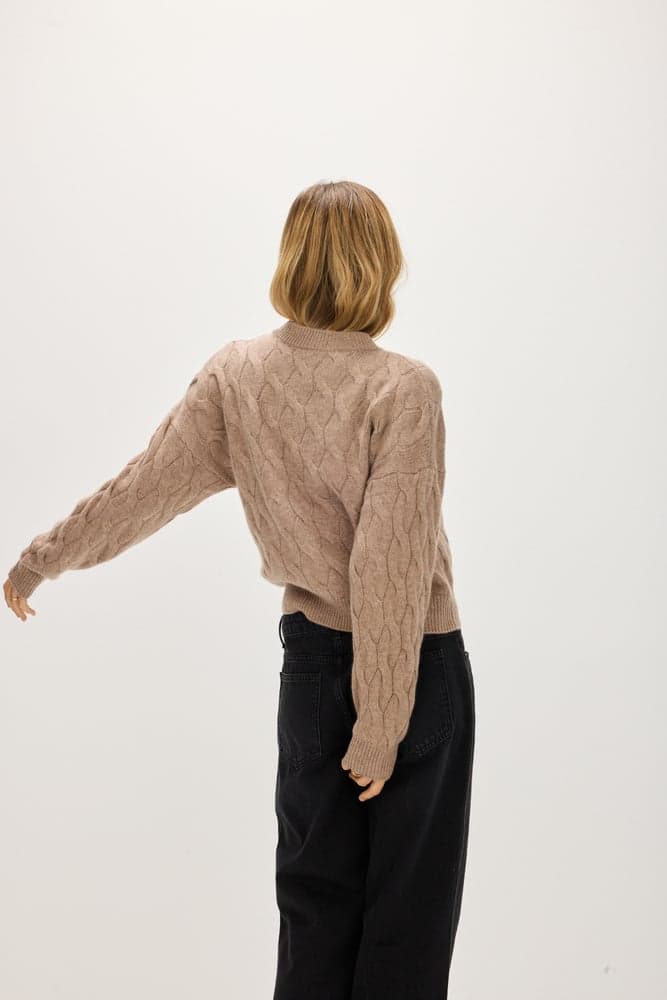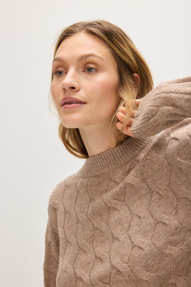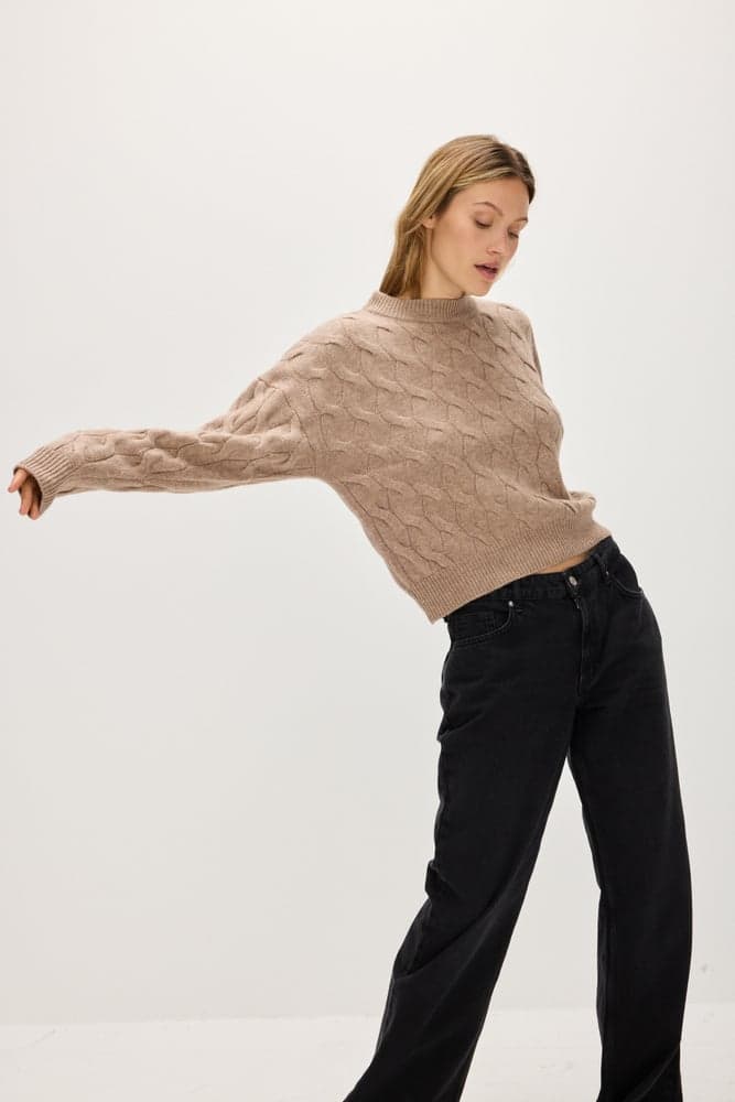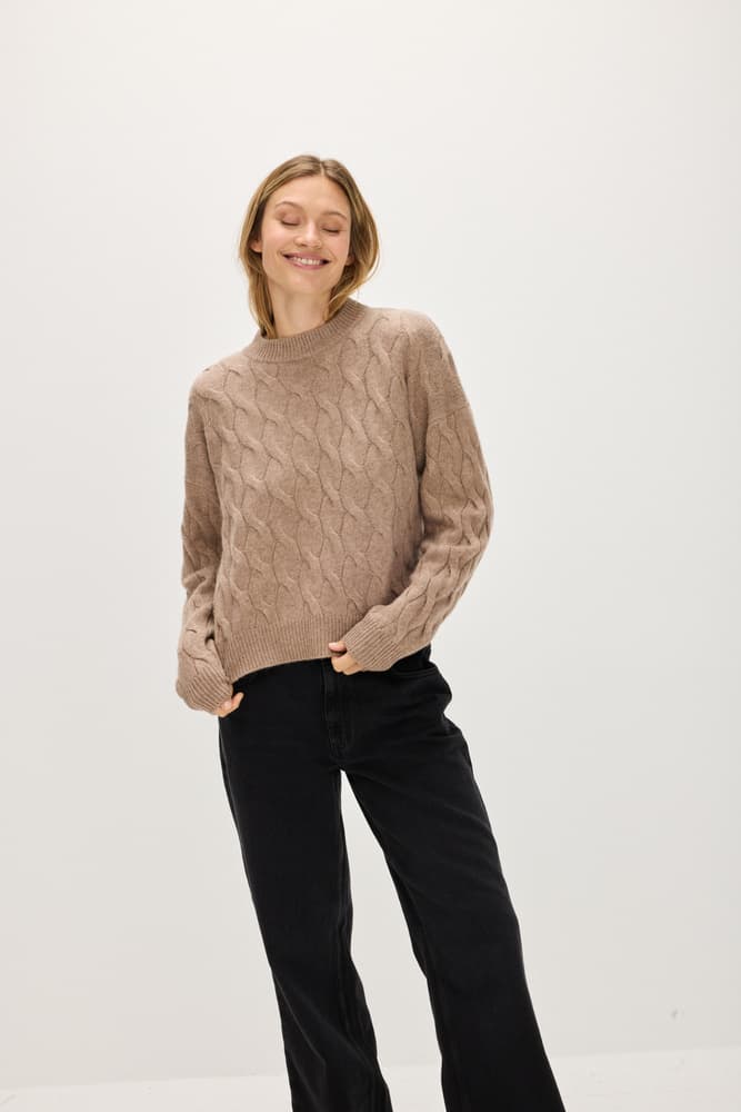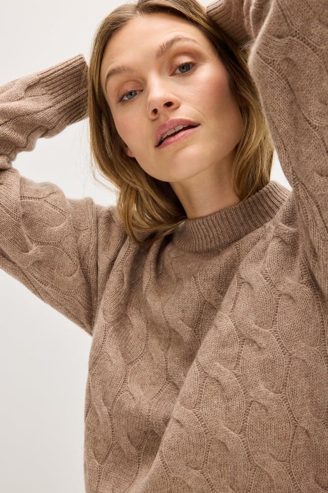 Stickad tröja med boxig skärning och ett brett kabelmönster. Vid passform med långa ärmar och nedhasade axlar. Rund halsringning. Resårstickning vid ärmslut och nederkant.
