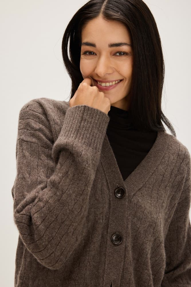 V-neck cable-knitted cardigan with wide large decorative button front. Straight boxy fit. Straight sleeves with ribbed cuffs.