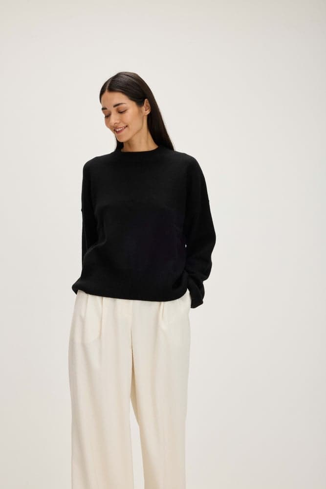 Slätstickad tröja med boxigt snitt. Vid passform med lång ärm och förlängd axel. Rund halsringning. Resårstickning vid mudd samt nertill.
