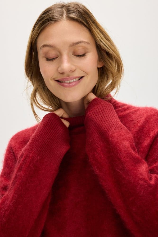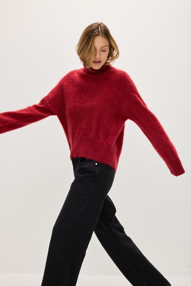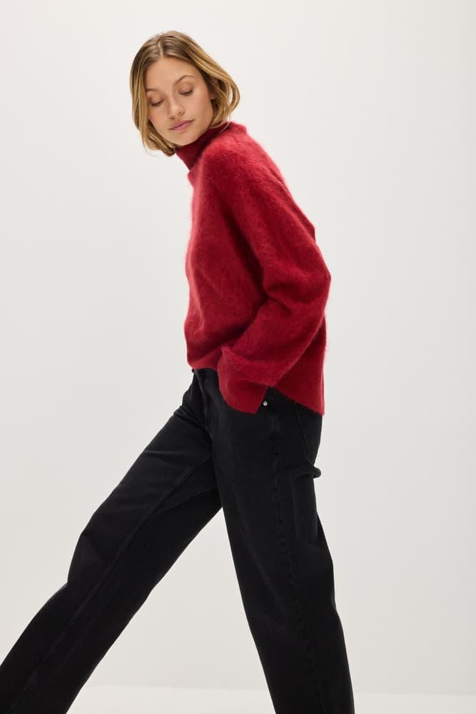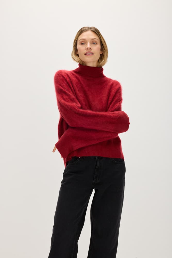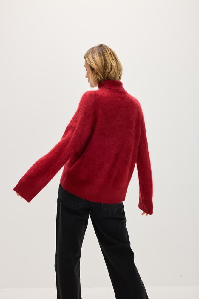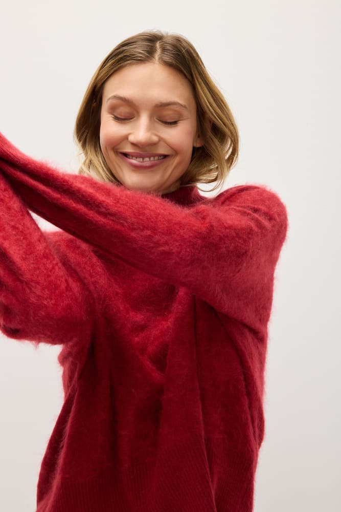 Stickad oversize tröja i vår borstade kashmirkvalitet. Resårstickning i ärmslut och nederkant samt resårstickad hög polokrage. Sänkta axlar. Lång passform och rundad rygg.