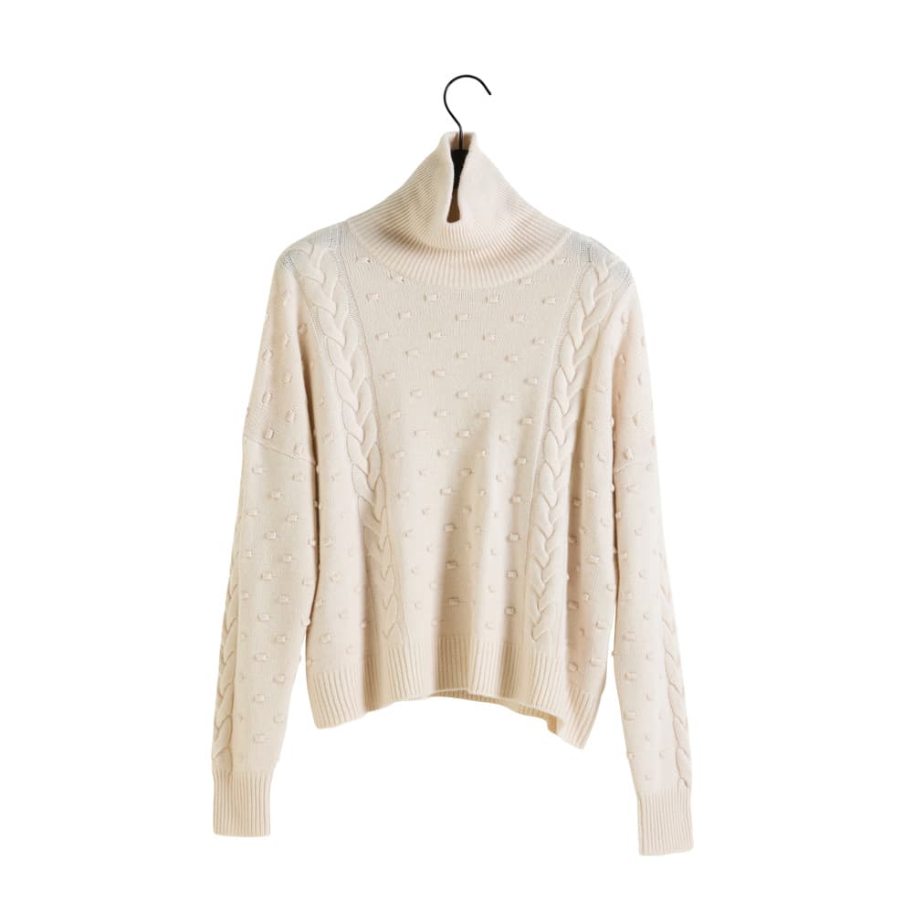 • An oversized turtleneck sweater with cable and dotted patterns. The sweater is wide over the body, but is slightly tighter over the arms. The body has a row of cables going down on each side, and the arms has a row of cables going down the middle. The dotted pattern is over the rest of the sweater.