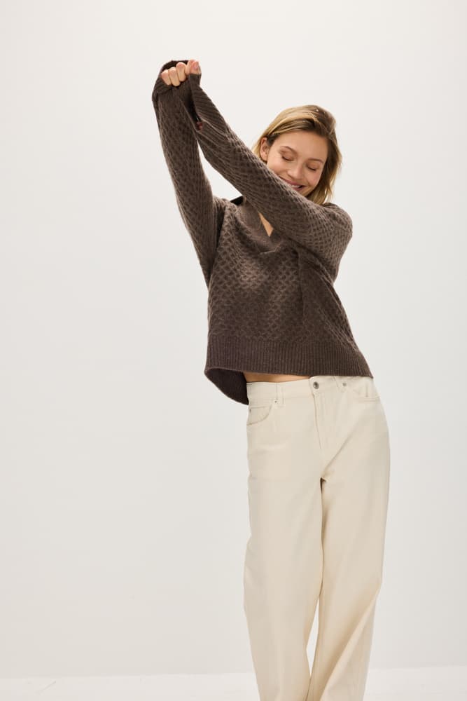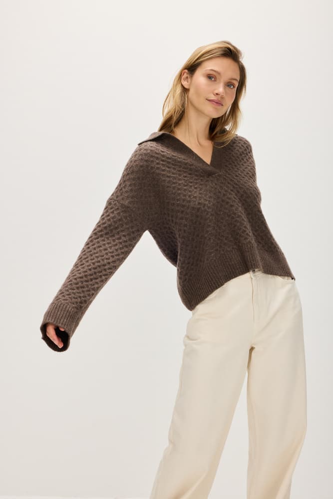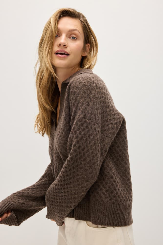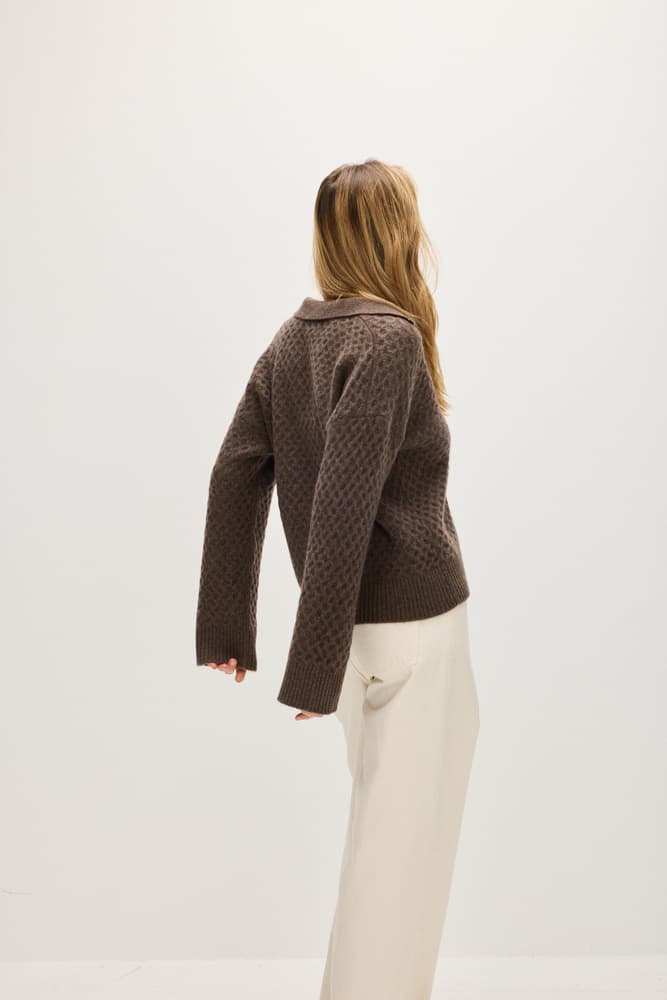 A sweater with an open collar, knitted in a geometric pattern resembling squares or diamonds all over. Wide ribbing at the cuffs and bottom hem. True to size and fit.
