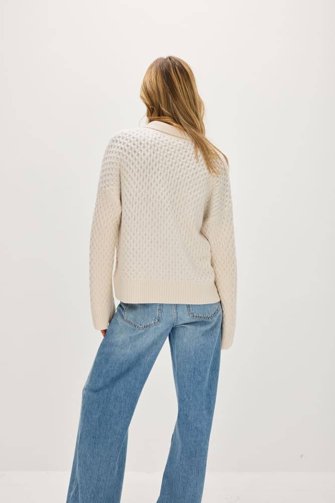 A sweater with an open collar, knitted in a geometric pattern resembling squares or diamonds all over. Wide ribbing at the cuffs and bottom hem. True to size and fit.