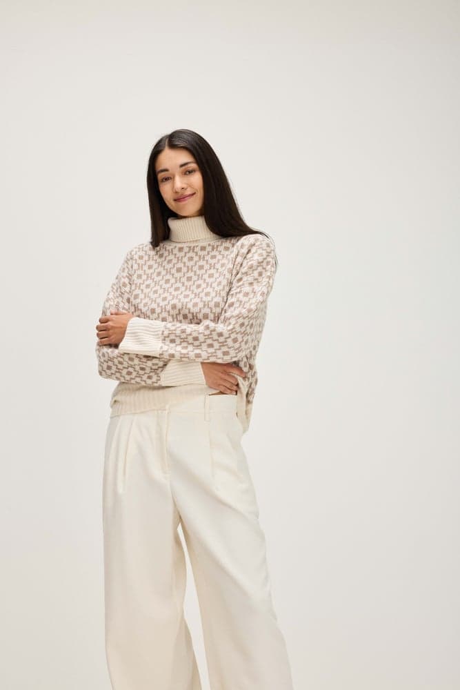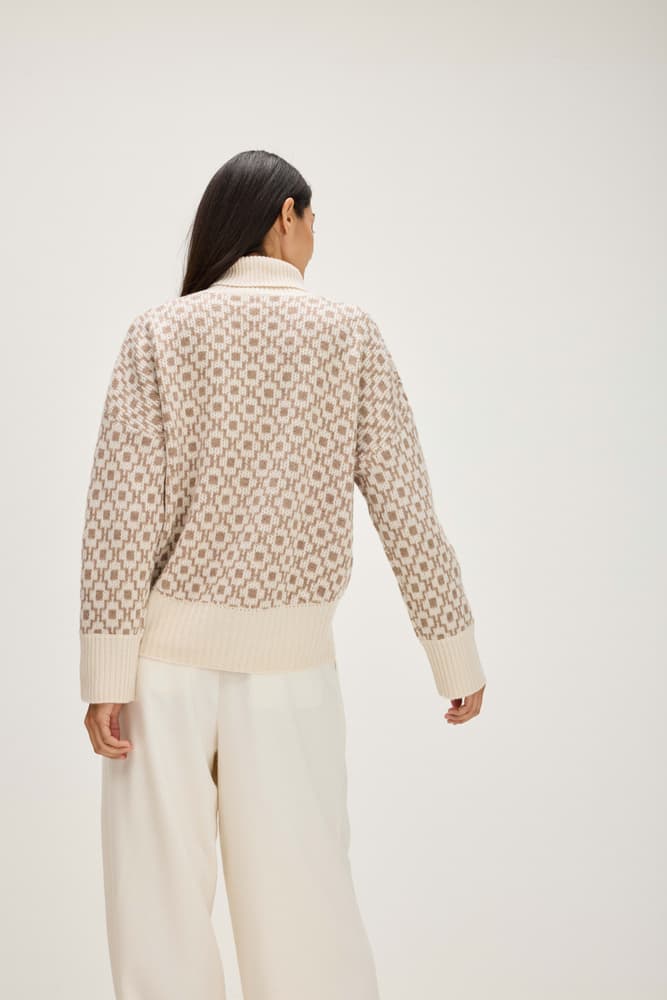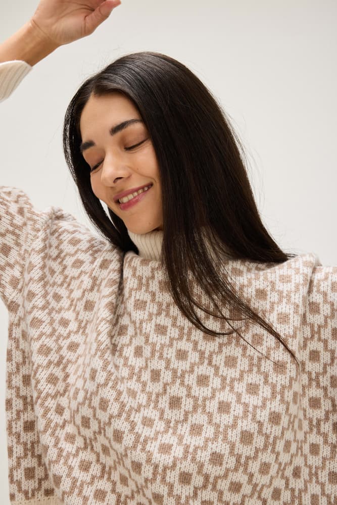 Knitted oversize sweater with a geometric pattern in contrasting colors. Elastic knitting at the cuffs and bottom and elastic knitted high polo collar. Dropped shoulders. Long fit and rounded back.