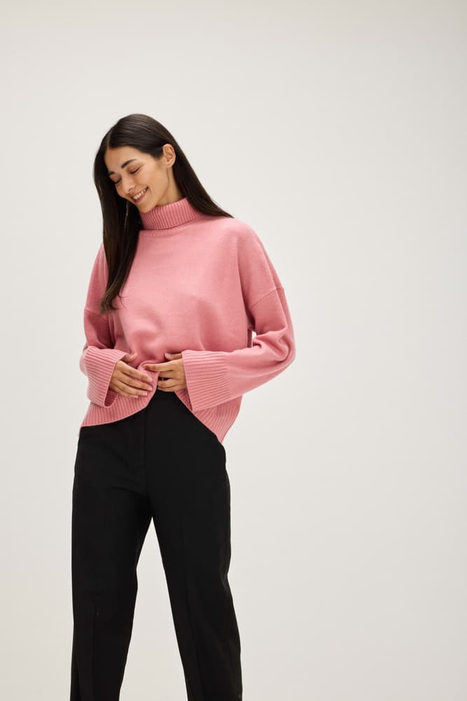 Stickad tröja i oversize modell. Resårstickning i ärmslut och nedtill samt resårstickad hög polokrage. Förlängd axel. Modellen är något längre och rundad baktill.