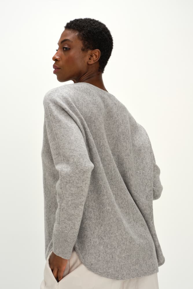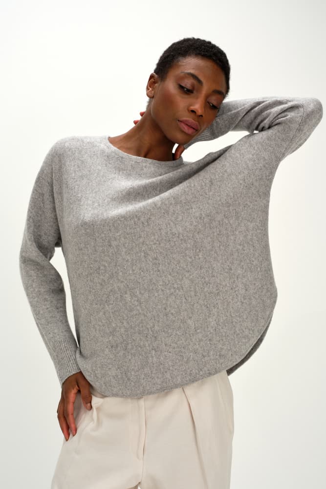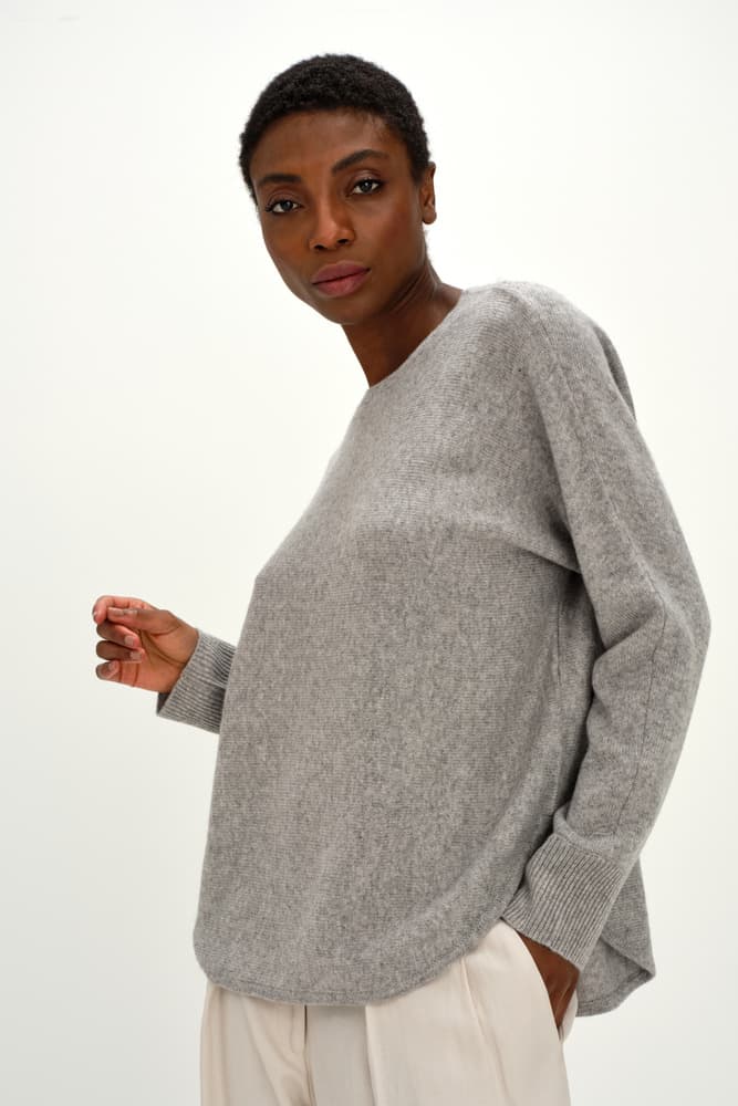 A longer version of our bestseller! The sweater has a round neckline, oversized fit and is flat knitted with slits on the sides. The hem is rounded at the front and back. Ribbing at the cuffs, and a longer body.