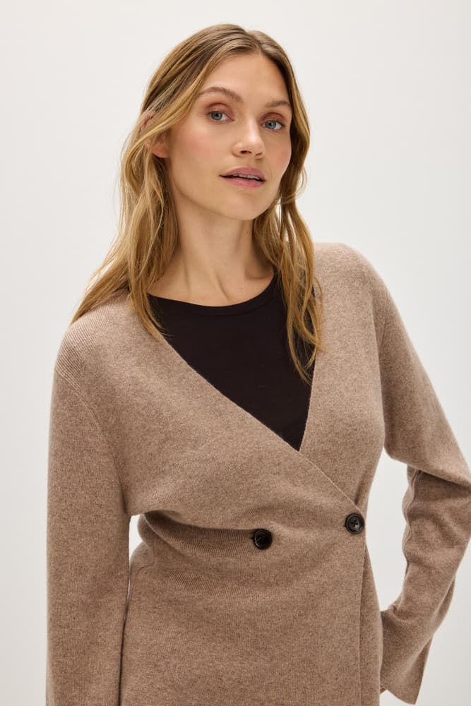 A minimalistic clean-cut jacket with two buttons on the horizontal that keeps it together.