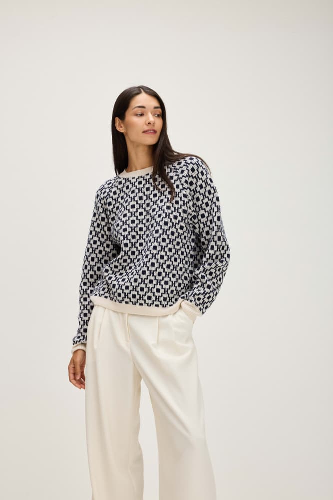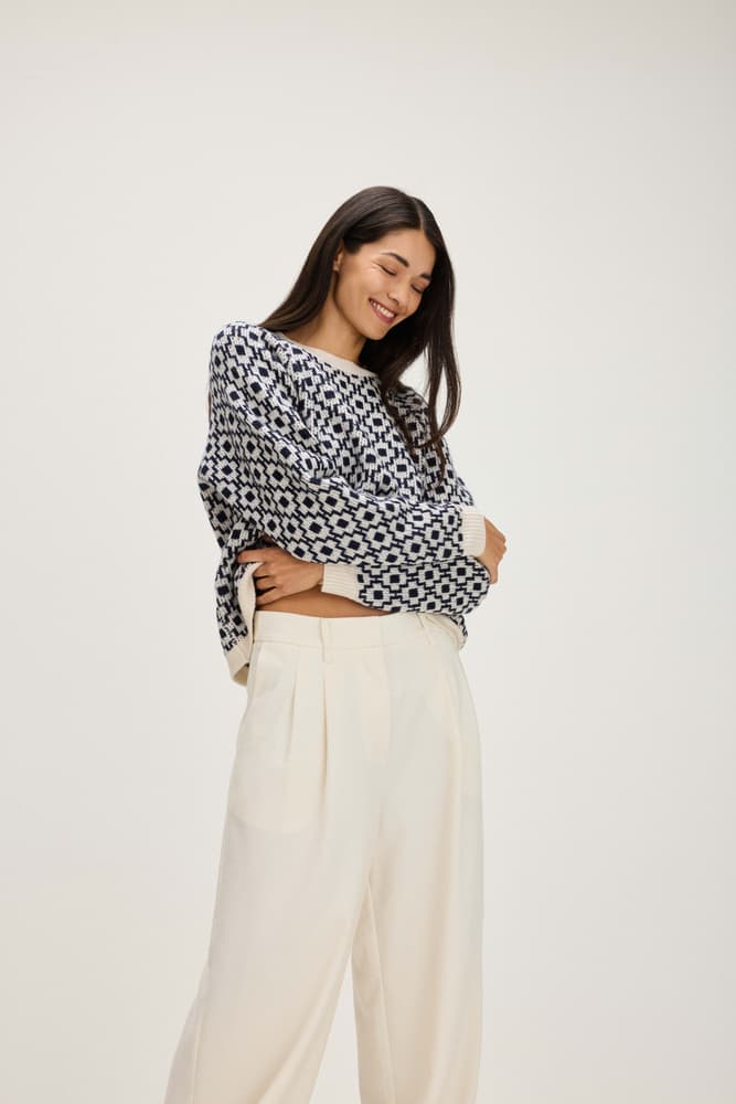 Knitted oversize sweater with a geometric pattern in contrasting colors. Elastic knitting at the cuffs and bottom and elastic knitted round collar. Dropped shoulders. Long fit and rounded back.