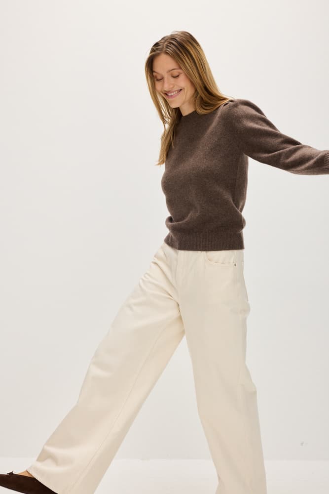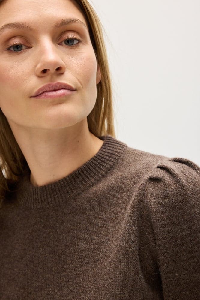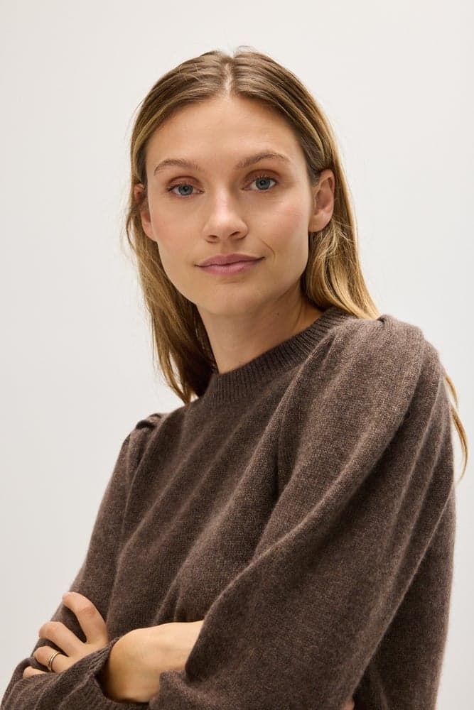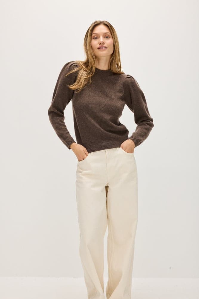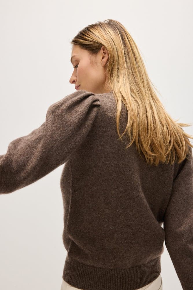 Chunky knit top with long sleeves. The sweater has puff details on the shoulders. Round neck and short fit with ribbed hem.