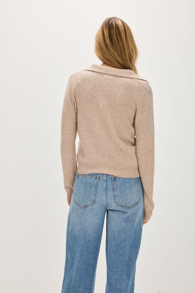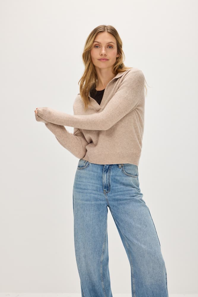 Knitted v-neck sweater with shirt collar. Short design and body hugging fit. Long sleeves with rib-knitting on the wrists.