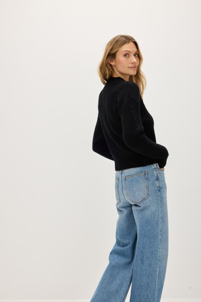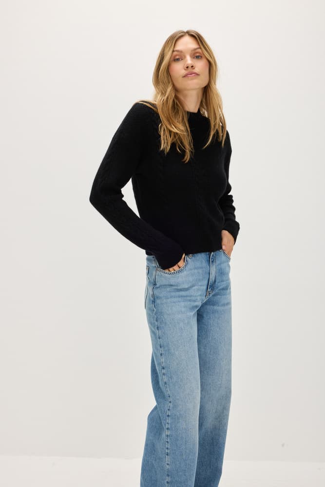 En tjockstickad långärmad tröja med kabeldetaljer och mönster på fram- och baksidan. Rund, högre halsringning med bredare ribbad krage. Ribbstickad i nederkanten.