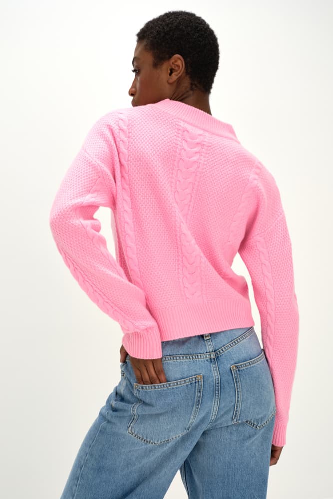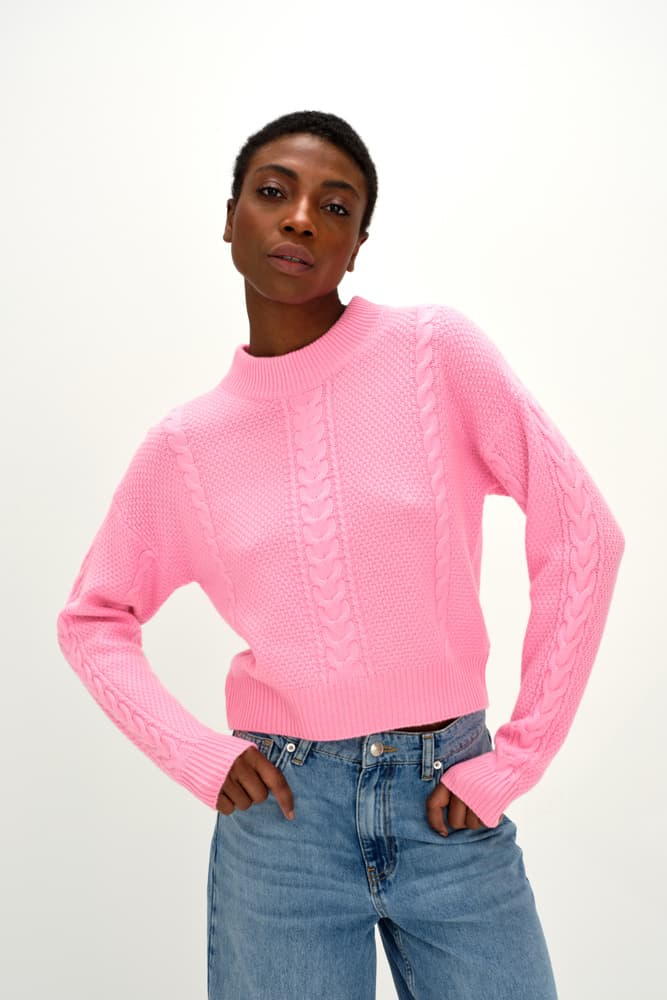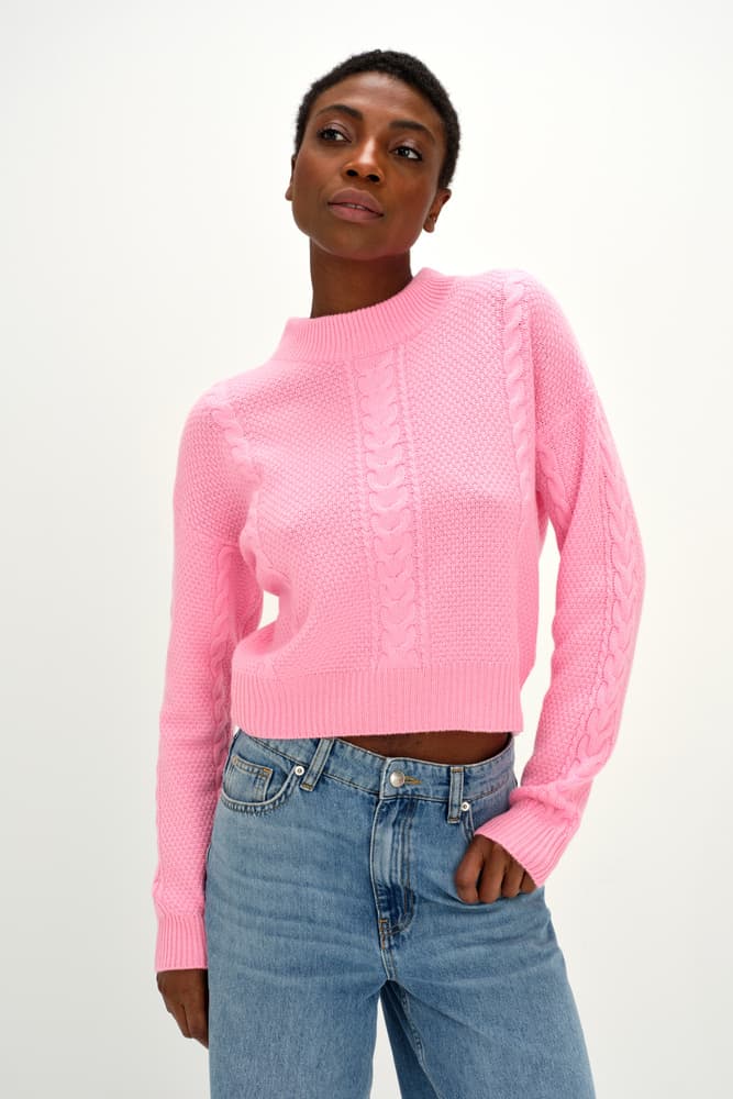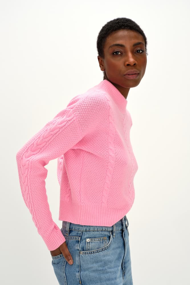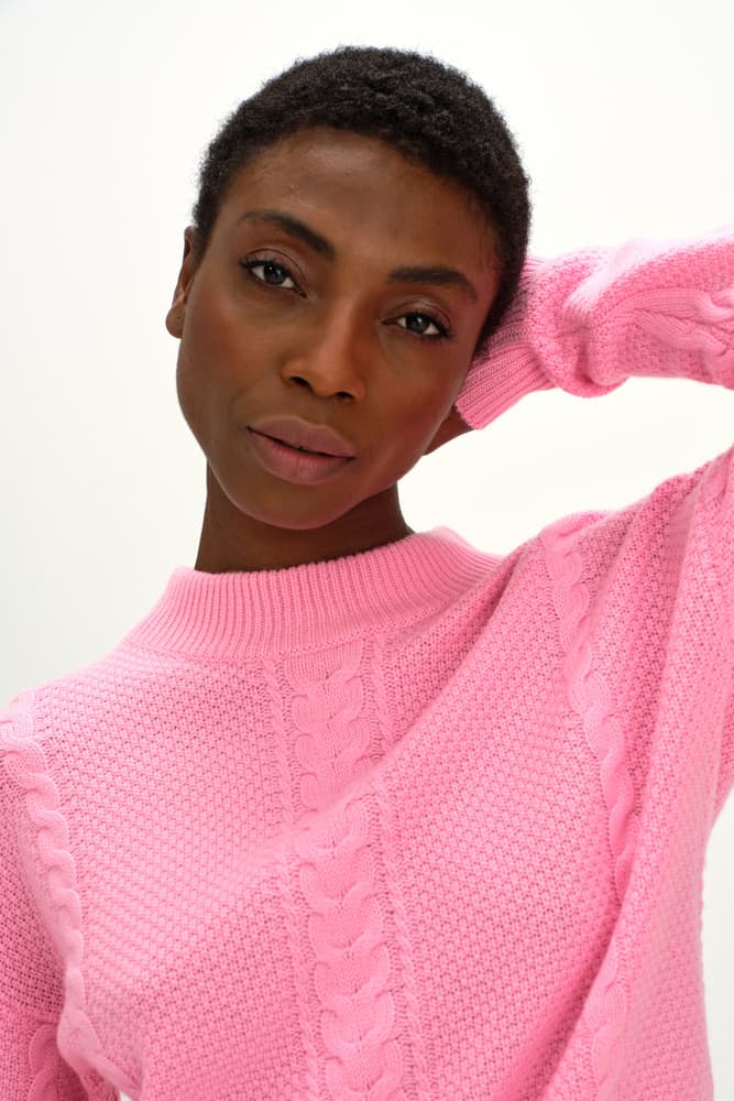 En tjockstickad långärmad tröja med kabeldetaljer och mönster på fram- och baksidan. Rund, högre halsringning med bredare ribbad krage. Ribbstickad i nederkanten.
