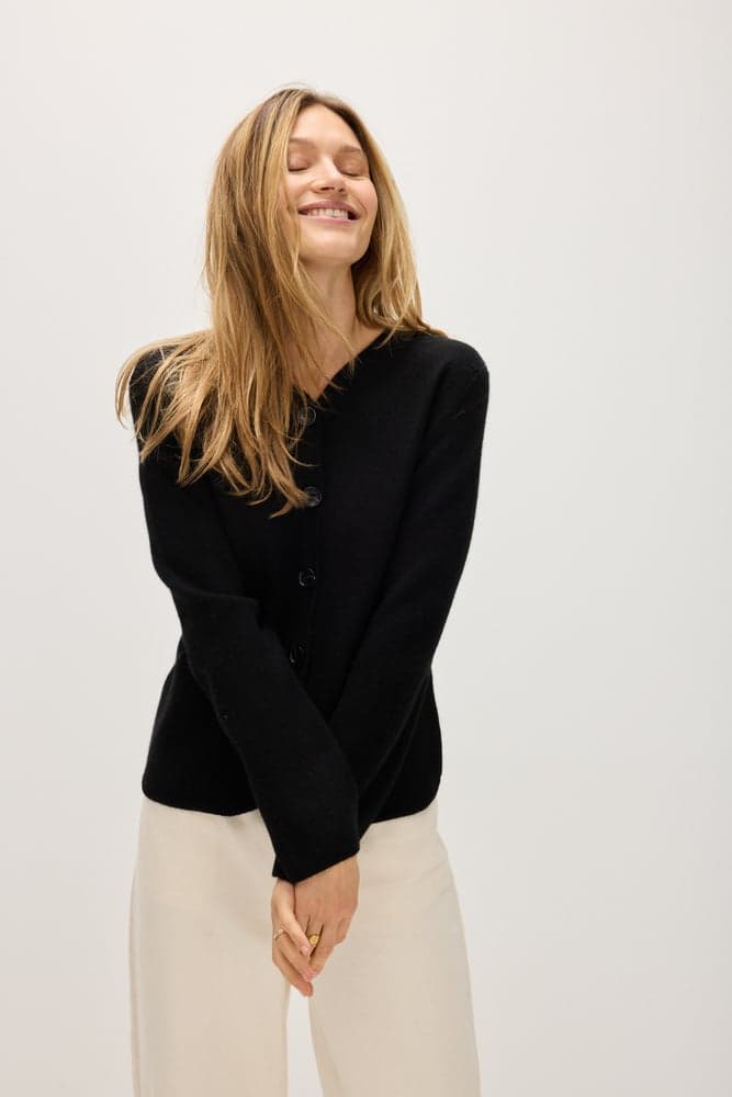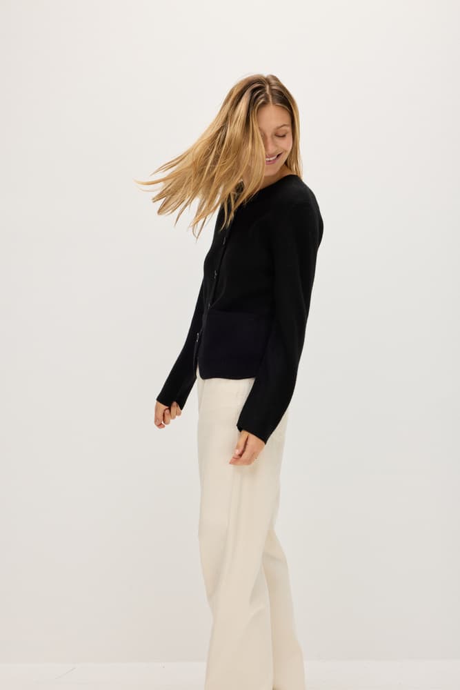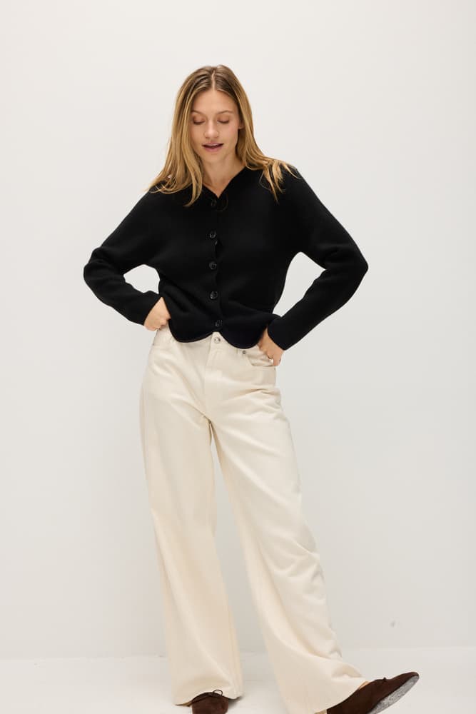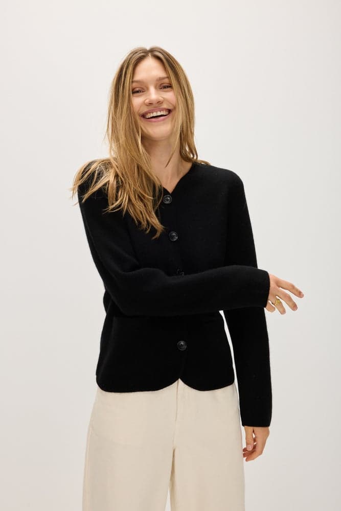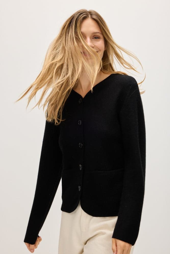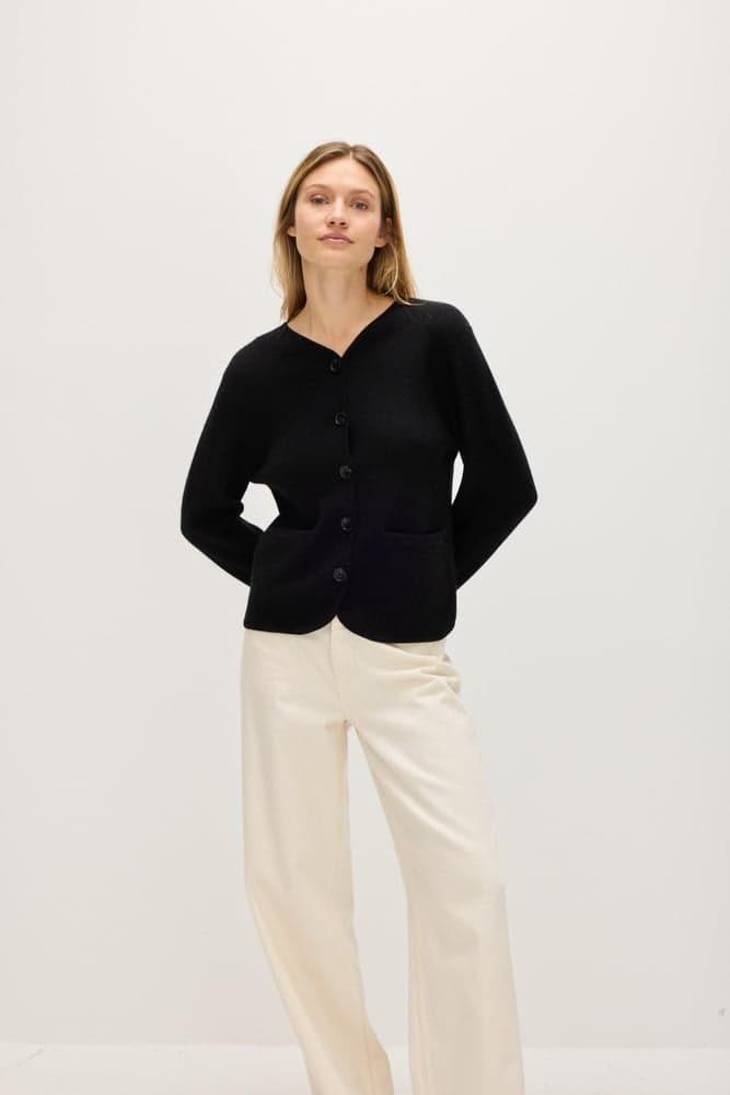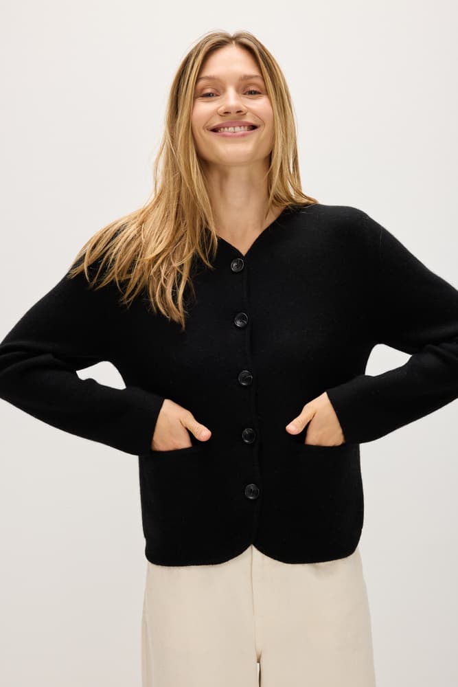 A straight hip-long jacket with black buttons and pockets on both sides. V-neck with an even edge and straight cut.