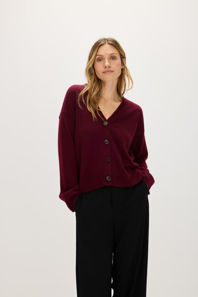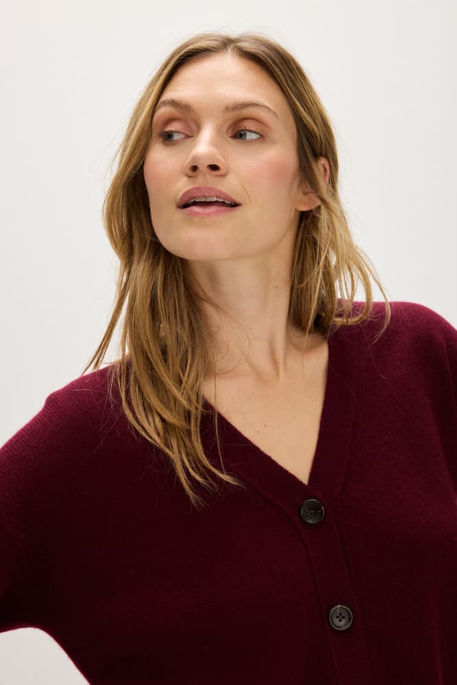 V-ringad kofta i slätstickning med bred knäppkant. Större dekorativa knappar framtill. Rak lite boxigare modell. Rak ärm med resårstickning i ärmslut.
