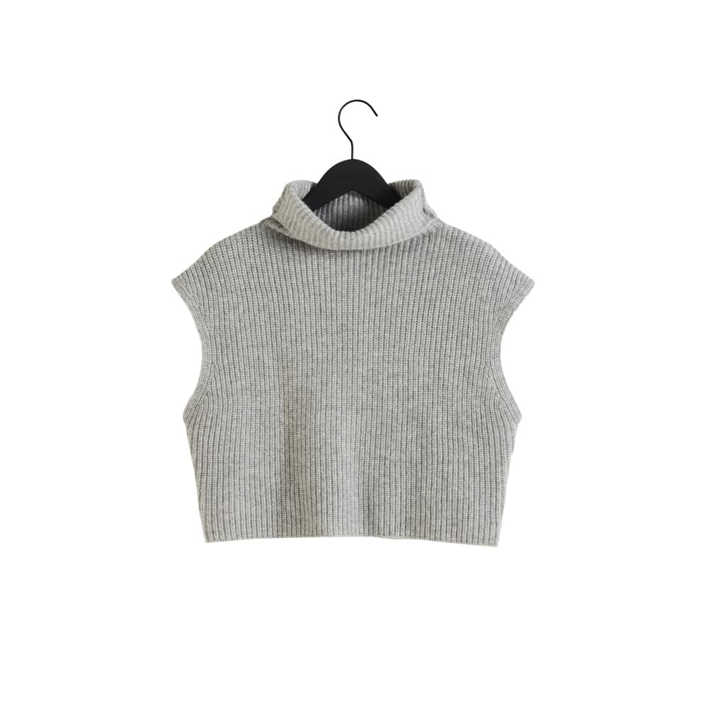 • A waist-length vest with ribbed knitting and a turtleneck.
