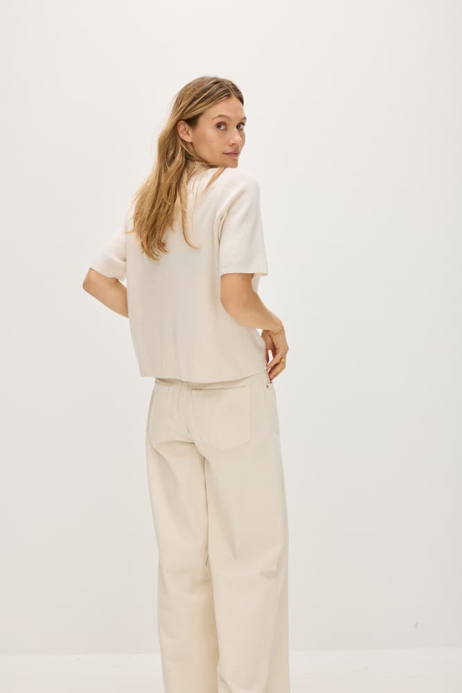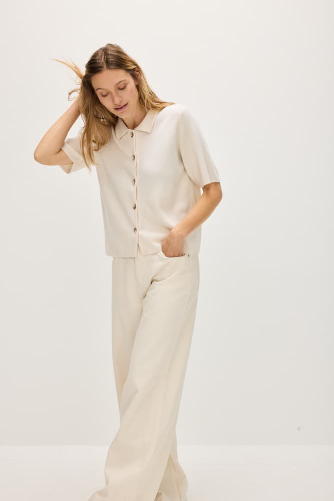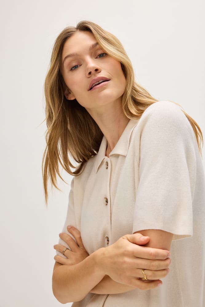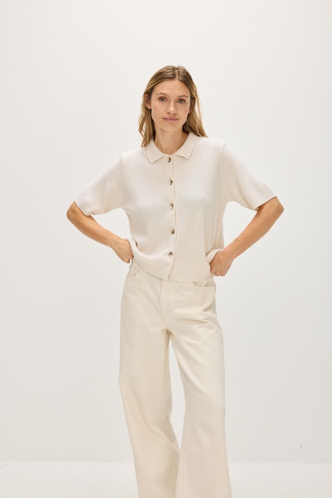Tröja i full needle-stickning med skjortkrage. Kort ärm och knappöppning på framsidan. Modellen har en lös och boxig passform och är något kortare i längden.