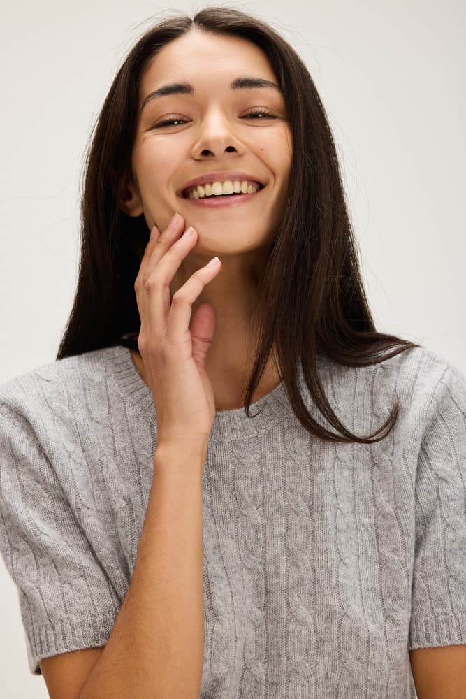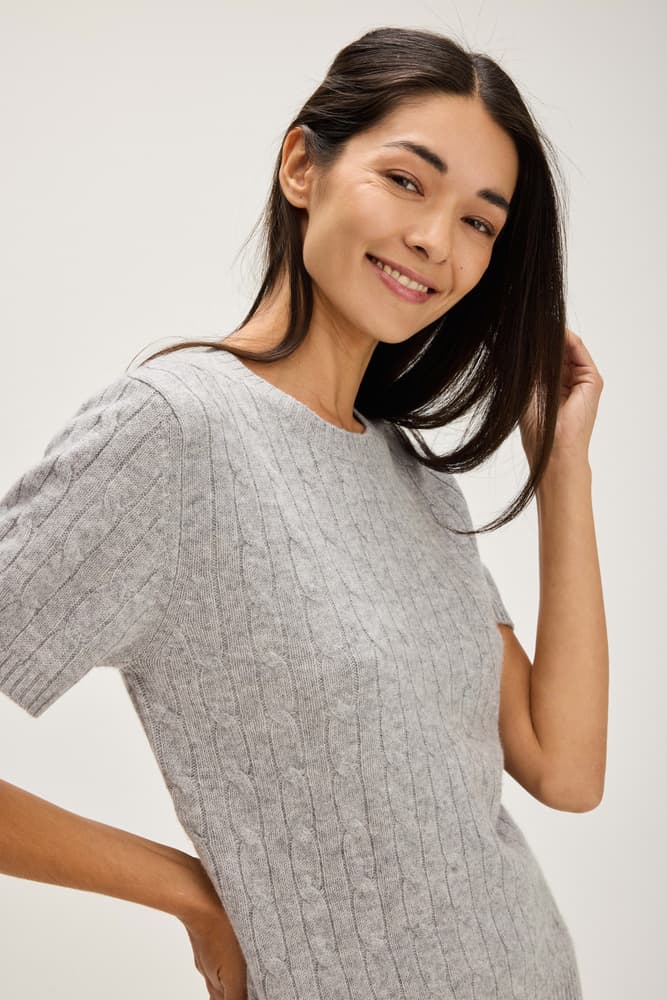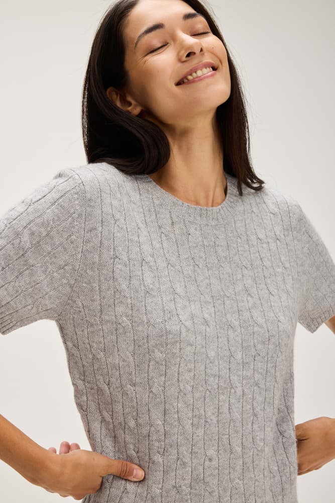 A cable-knitted, short-sleeved t-shirt with a round collar. Comes in a simple, classic slim fit and a True to size with a slightly longer sleeve. Plain knitted.