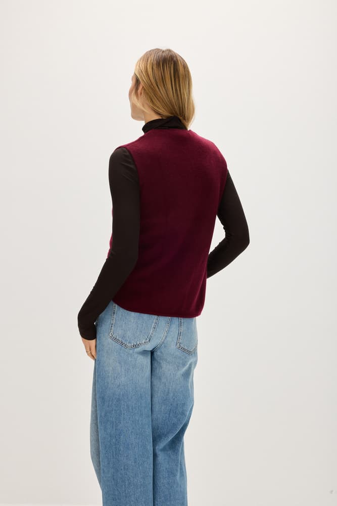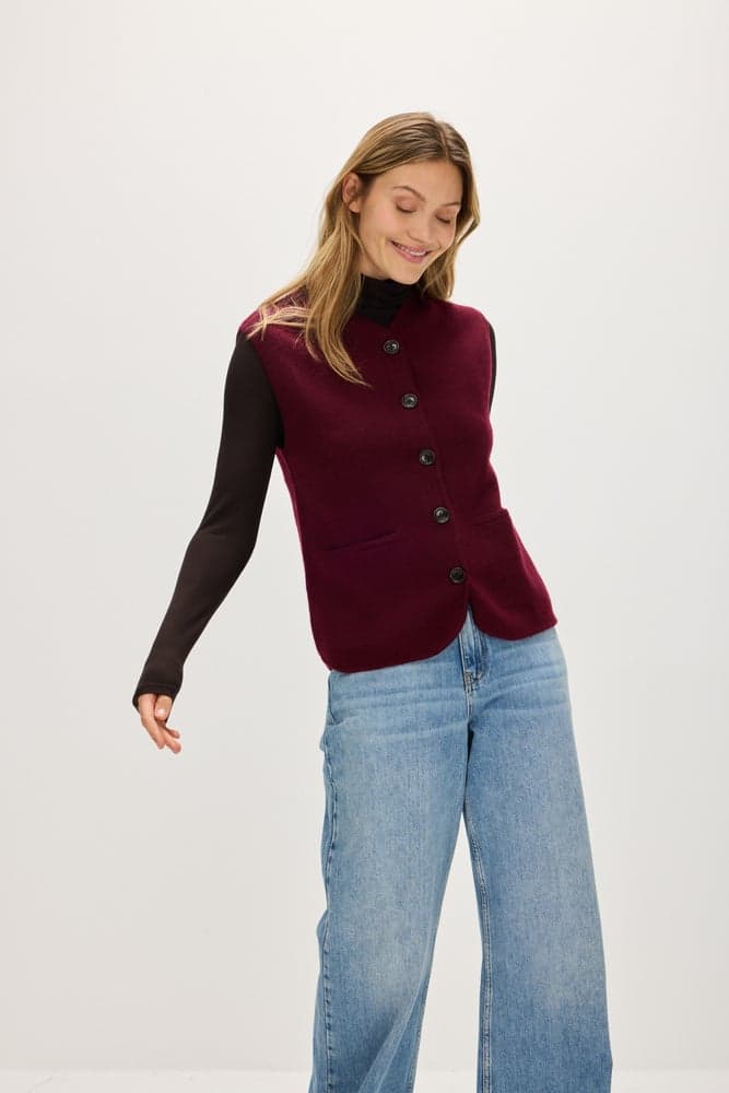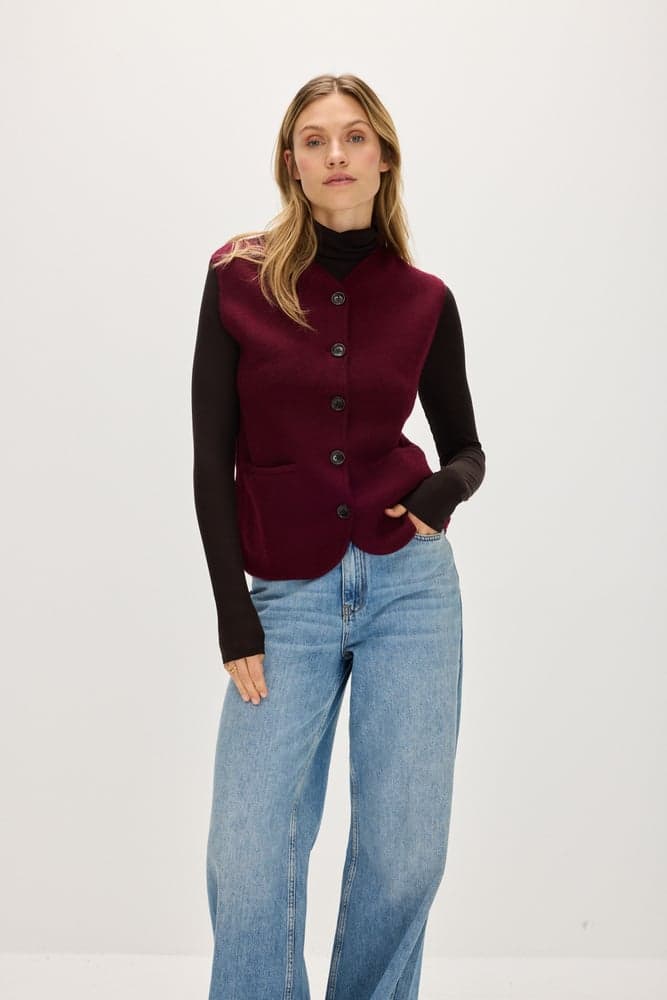 • A straight hip-long vest with black buttons and pockets on both sides. V-neck with an even edge and straight cut.
