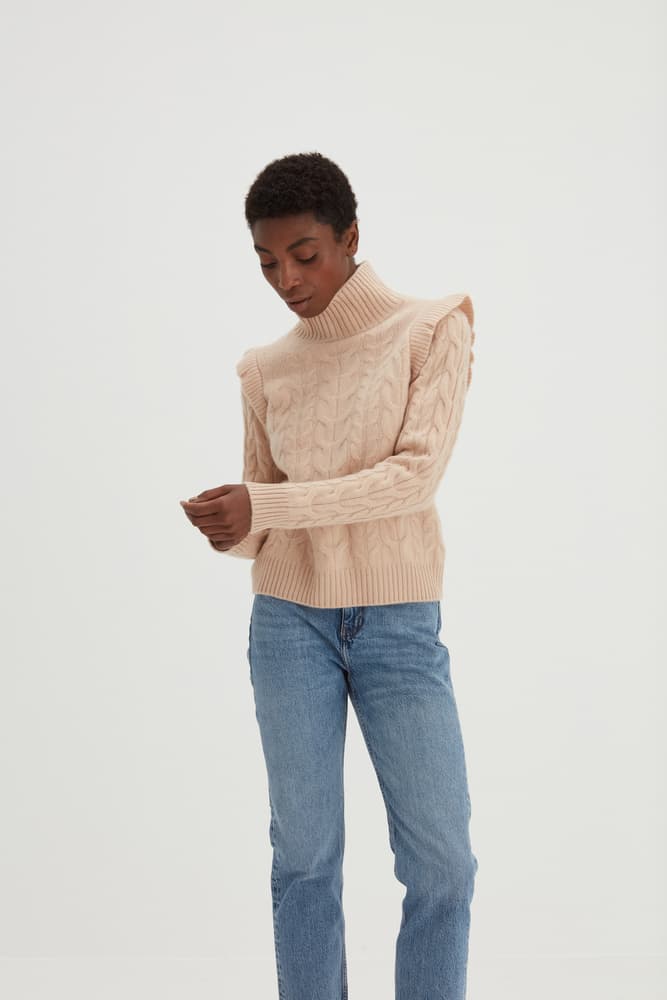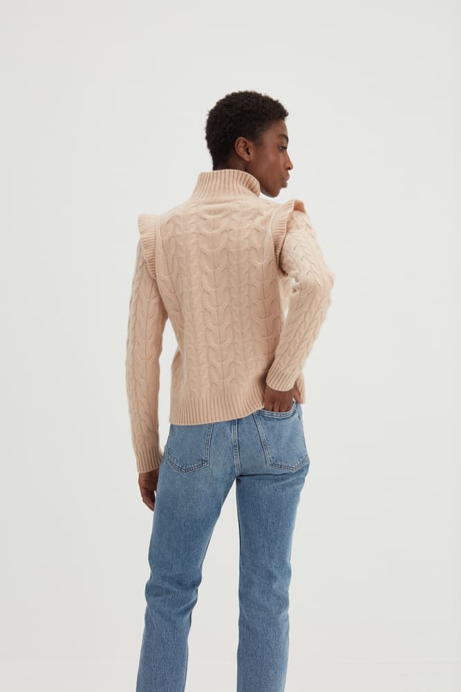 En tjockstickad tröja med kabeldetaljer och mönster fram och bak. Polokrage som kan bäras uppvikt eller nedvikt. Volanger på axlarna och raka ärmar med mönster.