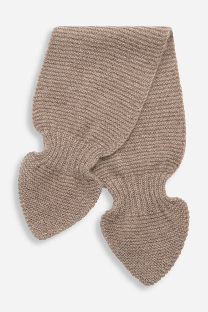 A knitted scarf that forms a closed bow when one part is threaded through the other.