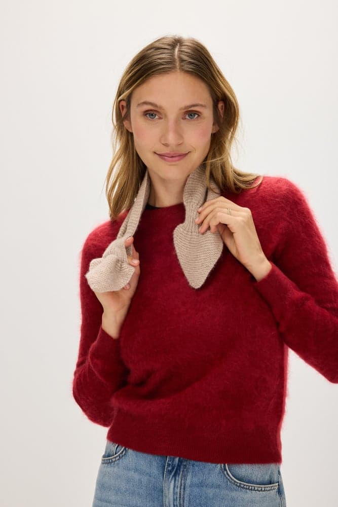 A knitted scarf that forms a closed bow when one part is threaded through the other.