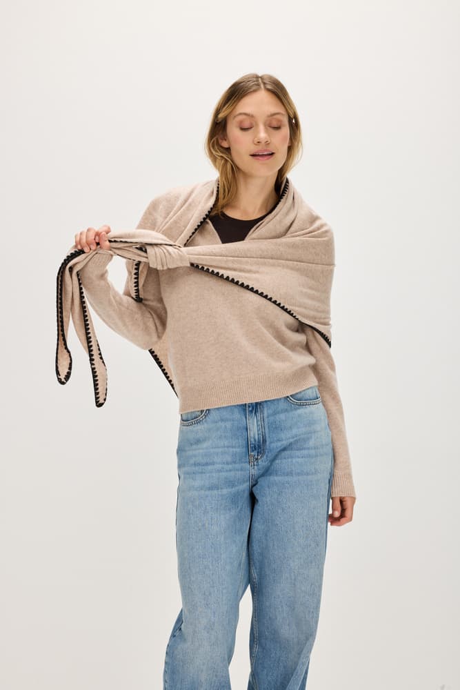A triangle shaped scarf that is flat-stitched with an hand-embroidered edge in a contrasting color.